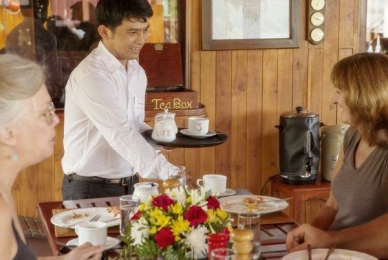Enjoy breakfast on Mekong Sun Cruise while taking in the beautiful views. Along the way, you may see the rustic scene of fishermen along the shore.